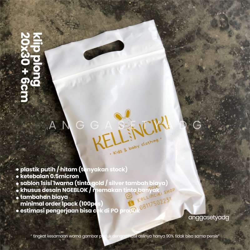 SABLON PLASTIK KLIP PLONG• Ukuran 20x30 + 6cm (pegangan/handle)• Bahan glossy / mengkilap• Warna plastik putih dan hitam (tanyakan stock)• Ketebalan 0.5micron• Sablon 1sisi 1warna• Tinta Gold / Silver +15rb (link ada di etalase)• Minimal Order 1pack : 100pcs • Desain dikirim ke email dalam bentuk PDF / CDR / AI jika tidak ada JPEG / PNG • Jika belum ada desain usahakan mengirimkan contoh dan menulis konsep tulisan agar tidak memperlama proses TERIMA KASIH :)#clip #plastic #plastikclip#Ziplock #plastik #plastikklip #plastikplong terima