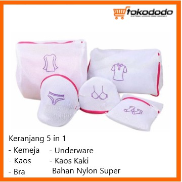 Laundry Bra 5 in 1Desain ritsleting, nyaman bagi Anda untuk memasukkan pakaian atau mengeluarkannyaDengan pakaian tercetak di tas, mudah untuk menyortir dan mengenali pakaian AndaTas double layer yang menebal, melindungi pakaian dari kerusakanDengan jaring untuk mendistribusikan air secara teratur dan menghemat lebih banyak waktuKeranjang 5 in 1- Kemeja- Kaos- Bra- Underware- Kaos KakiBahan Nylon