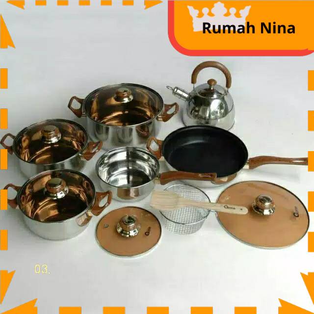 Maaf tidak menerima dropshipCookware Set Berbahan Stainless SteelKini saatnya Anda melengkapi perlengkapan memasak dengan Oxone OX-933 Cookware Set untuk aktivitas memasak yang lebih mudah dan menyenangkan. Alat masak dari Oxone ini terbuat dari stainless steel yang dapat mengahantarkan panas dengan baik sehingga masakan lebih cepat matang dengan kematangan yang sempurna. Dengan menggunakan bahan yang bersifat non-reaktif secara kimia, memasak pun menjadi lebih aman dan tidak ada senyawa kimia yang akan tercampur di dalam makanan.Selain itu, bahan stainless steel tersebut juga menjadikan Oxone Eco Cookware Set kuat, tidak mudah penyok, menyusut ataupun memuai. Pada permukaan dalamnya mulus tanpa pori yang membuatnya mudah di cuci dan tidak membuat makanan di dalamnya menempel. Peralatan masak Oxone ini juga tidak akan membuat bau masakan menyerap kedalamnya sehingga saat Anda menggunakannya untuk memasak kembali, masakan Anda akan tetap terjaga aromanya.Pegangan Kayu Tahan PanasTidak hanya itu saja, cookware set ini juga memiliki gagang pegangan yang terbuat dari kayu yang lebih tahan akan panas. Tentu hal tersebut akan semakin memudahkan Anda ketika memasak, karena Anda dapat menyentuhnya tanpa khawatir panas dan tanpa menggunakan sarung tangan anti panas. Berbeda dengan gagang cookware set pada umumnya, pada cookware set Oxone gagangnya dibuat lebih dingin dan nyaman untuk dipegang.Cookware Set Berdesain ClasicOxone OX-933 Cookware Set hadir dengan desain classic, modern dan elegan, cocok digunakan untuk di rumah, restoran maupun tempat usaha Anda. Terdiri dari beberapa peralatan masak seperti sodet kayu, wajan penggorengan dengan tutup kaca, panci dengan tutup kaca dan dilengkapi dengan teko air. Semua peralatannya akan membantu Anda dalam mengolah bahan makanan dan minuman untuk disajikan bagi keluarga atupun kerabat.