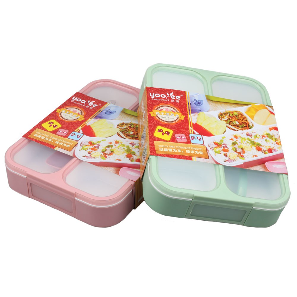 Yooyee Kotak Makan Grid Bento Lunch Box 4 Sekat Anti BocorReady warna: Hijau & pink peachDimensi (PxLxT) = 23 x 17 x 4,6 cm (1000 ml)- Ditutupnya terdapat karet antar sekat, sehingga makanan tidak bercampur- Bahan plastik tebal BPA Free- Tahan panas sampai 120 degC- Dilengkapi sendok#tempatmakan #yooyee #antitumpah #tempatmaka