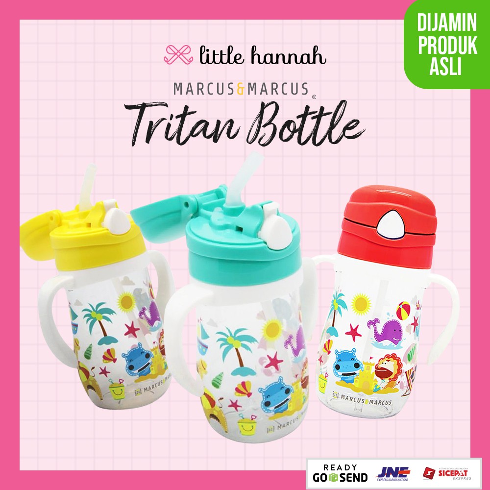 TRITAN STRAW BOTTLESkip the sippy cup and move straight to the “big-kids” cup, Marcus & Marcus Tritan Straw Bottle will help make the transition easier. Our handy bottle is made with BPA and Phthalate free plastics that is lightweight and durable. It features a push button lid, a pop-up straw, andintegrated handles that make it easy for little hands to hold on. The Marcus & Marcus Tritan Straw Bottle guarantees comfort and prevent spills and are BPA free and Phthalate free. Choose from Marcus the Lion Cub, Pokey the Piglet, Lola the Giraffe, Ollie the Elephant and Willo the Whale.Features:BPA/Phthalate freeHygienic push-button lid with pop-up silicone strawSoft silicone straw mouthpiece is durable and easy to sipShatter resistanceSpill proof designTwo easy grip handles for little hands Cleaning and Care:Top-Rack dishwasher safeHand washing is recommended for best resultsDo not use abrasive cleanser or bleach productsProduct Size:16 x 7.5 x 12 cm(Capacity:350ml)Material:Tritan +PP +Food grade siliconeWithstand Temp:-5°C to 100°C-20°F to 212°FAge: