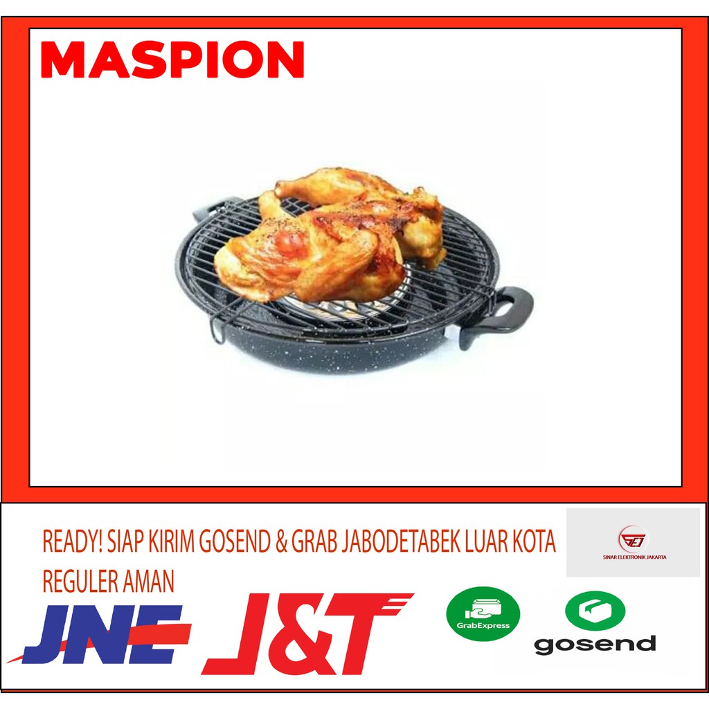 Pemanggang Maspion Magic Roaster- Diameter 34cm- Dapat mengubah api kompor menjadi api bara (tanpa menggunakan arang dan mengipasi bara api di arang)- Bahan bahan baja dilapisi porcelain enamel berkualitas dengan corak bintik putih dilengkapi gagang yang kokoh dan tahan panas.- Sistem pemanas menggunakan pemutar, sehingga makanan yang dipanggang dapat matang dengan sempurna- Dapat digunakan di atas kompor gas maupun kompor minyak tanahDapat digunakan untuk memanggang sate, ikan, daging, sosis, dsb. Cocok untuk menemani acara anda bersama keluarga dan teman (spt : BBQ diawal tahun, pesta taman kecil)Cara Penggunaan : 1. Isi bagian bawah pemanggang (wajan) dengan air secukupnya agar tetesan kecap dan bumbu mudah dibersihkan dan makanan tidak cepat gosong.2. Letakkan pemanggang di atas kompor dan nyalakan kompor. Tunggu bbrp menit, bagian tengah pemanggang (roller tray) memerah akan berputar sehingga makanan akan matang dengan sempurna dan merata.3. Taruh bahan makanan yang ingin dipanggang diatas rack.4. Panggang sampai matang dengan membolak-balik bahan makanan tsb (daging, ikan, sosis,