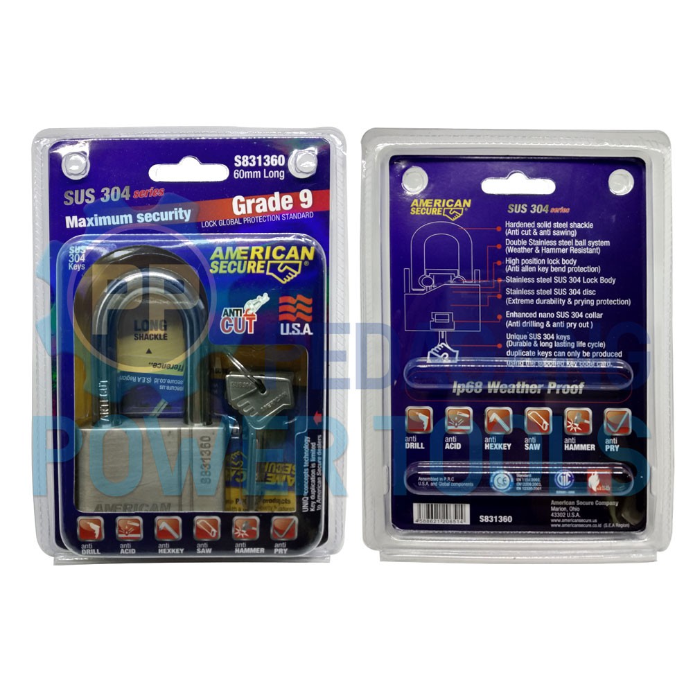 Maximum Security :- Anti potong, anti bor, anti linggis, anti palu, anti cairan setan- Material stainless SUS 304 series anti karat.- GRADE 9 Lock Global Protection Standard- IP68 Weather Proof* ANTI DRILL* ANTI ACID (Cairan Setan/Kimia)* ANTI HEXKEY* ANTI SAW* ANTI HAMMER* ANTI PRY- Hardened solid steel shackle (ANTI Cut & ANTI Sawing)- Double Stainless steel ball system (Weather & Hammer Resistant)- High Position Lock Body (ANTI Allen key bend protection)- Stainless steel SUS 304 Lock Body- Stainless steel SUS Disc (Extreme Durability)- Enhanced nano SUS 304 collar (ANTI Drilling & ANTI pry out)- Unique solid brass key (Durable & Long lasting life cycle)AMERICAN SECURE CompanyMarion, Ohio43302 U